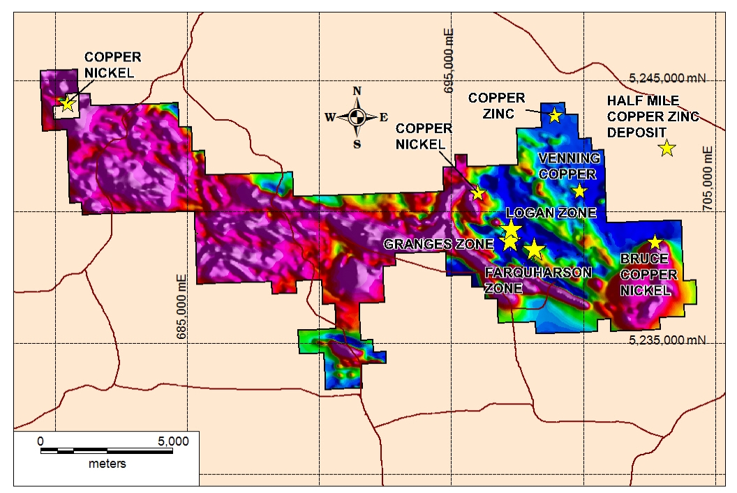 The Goodwin claims now cover a trend of aeromagnetic anomalies associated with gabbro intrusions that extend from the Bruce copper nickel occurrence westward for 25,000 meters as shown on the aeromagnetic map above (Figure 1). The new acquisition expands the Goodwin project to cover 11,450 hectares of prospective ground.