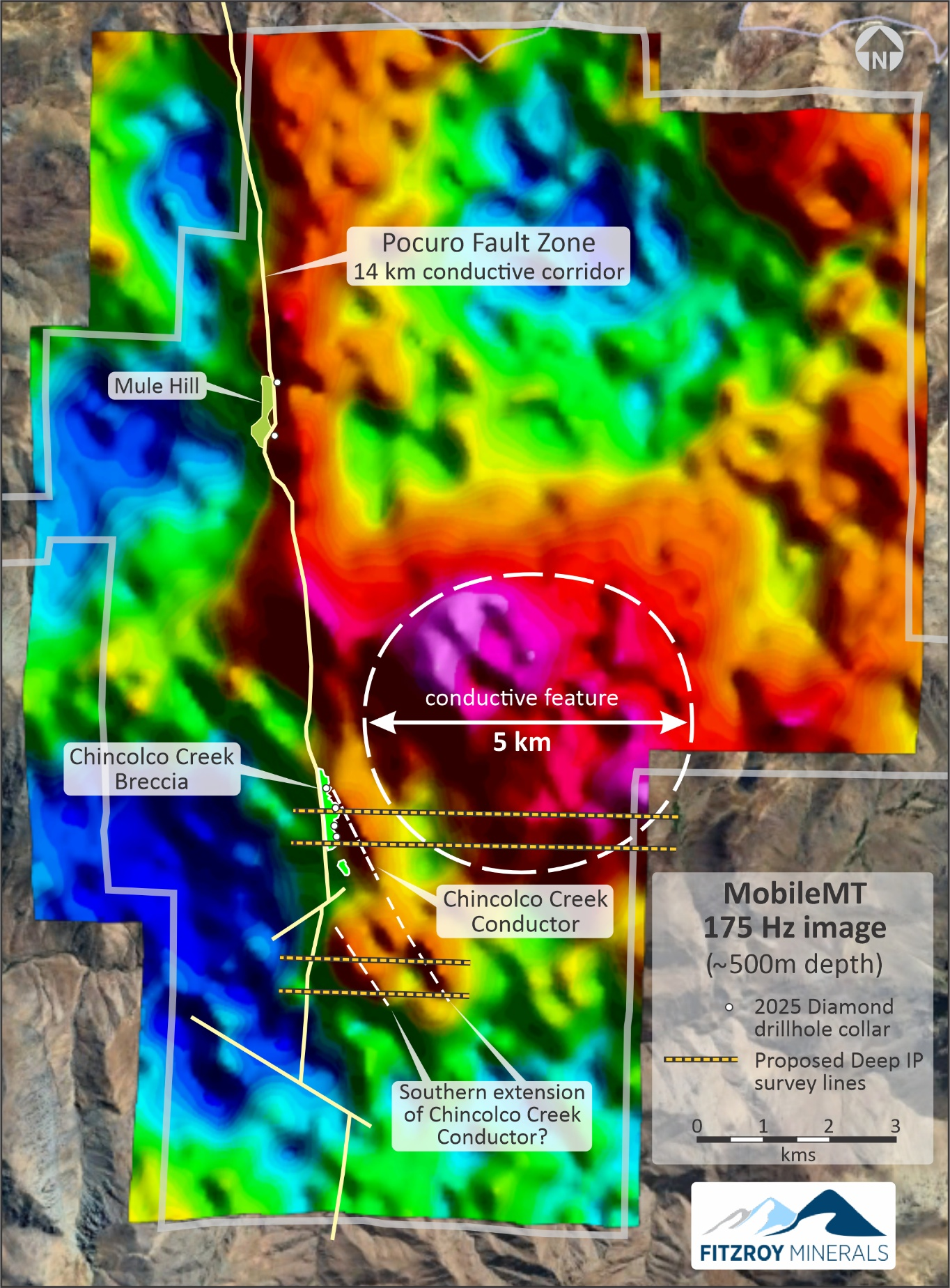 Merlin Marr-Johnson, President and CEO of Fitzroy Minerals, commented: “The MobileMT survey shows that Caballos hosts the type of plumbing architecture and conductive anomalies that are often associated with world-class mineral systems in Chile. The standout anomaly is a huge circular feature about five kilometres across that connects to the sulphide mineralization we intersected in drilling last year. There are also conductive anomalies that suggest the Chincolco sulphide mineralization might continue for several kilometres to the south, just below the surface. We will follow up with further integrated data-processing, and a ground Deep IP survey to gain chargeability information and improve target ranking, ahead of drilling.