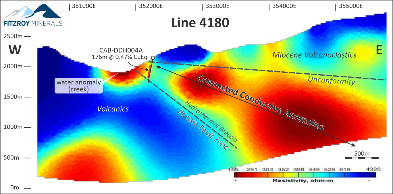 Closer to the north-south axis of the Chincolco Prospect, a linear conductive anomaly approximately 1.5 km long is evident. Diamond drill hole CAB-DDH004A was the southernmost drill hole along the breccia (Figure 1), and the anomaly continues to the southeast from that drill hole which intersected 176 m @ 0.31% Cu, 249 ppm Mo, 0.04 g/t Au (0.47% CuEq1) from 156 metres [News Release dated January 13, 2026]. Drill hole CAB-004A intersected a weak portion of the anomaly and the deeper, stronger portion of the anomaly remains untested (Figure 2).