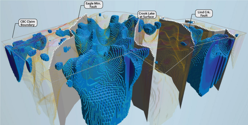 - The two surveys also revealed two significant cross-structural zones. The northern Crook Lake cross-structural location within the indicated caldera and the magnetic low, are of greater significance in that it may be the most obvious indication of a hydrothermal or collapsed breccia zone. In the south, one of the three structures formulating the cross-structure, is a southerly trending structure correlating with a magnetic low. This location would be also be highest priority exploration area.