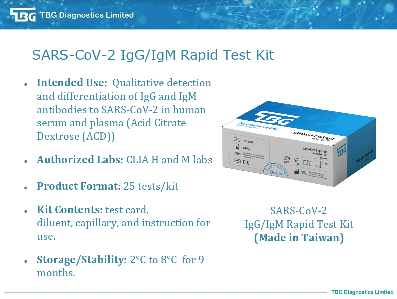 TBG Biotechnology Corp. (TBG) is a global molecular diagnostics company dedicated to the development, manufacture and marketing of molecular diagnostics kits, instruments and services. With its research and development based in the US, Taiwan and China, TBG manufactures its products in its ISO13485 certified facility in Xiamen, China serving the clinical labs of both hospitals and independent reference labs, blood centers and bone marrow registry labs around the world.