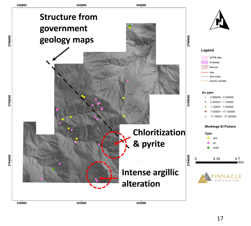 On the separate Maria Fernanda 2 (‘MF2’) claim block to the southwest (Figure 3), 3 shafts, 14 adits and 22 pits are somewhat scattered across the concession. While this area has never been explored by modern methods, government maps indicate a northwest-southeast trending structure passing through the middle of the block, parallel to the Dos de Mayo system and to the regional structural trend. The LiDAR also indicates a number of smaller structures perpendicular to this trend. The road from Topia passes through the middle of the block and road cuts locally display intense argillic alteration and pervasive chloritization with minor pyrite that, collectively, may be indicative of a buried hydrothermal system. Several of the pits interpreted from the LiDAR appear to lie in close proximity to this zone. Pinnacle’s geological team is planning a systematic and thorough evaluation of the area, commencing early in the New Year.