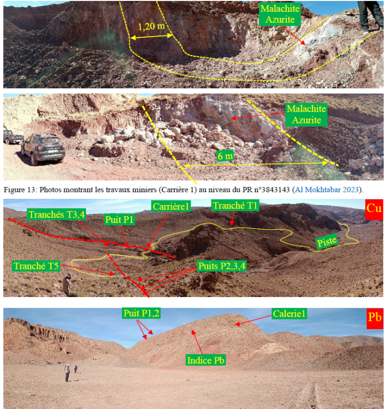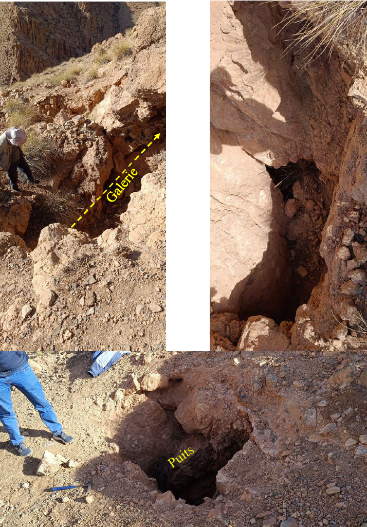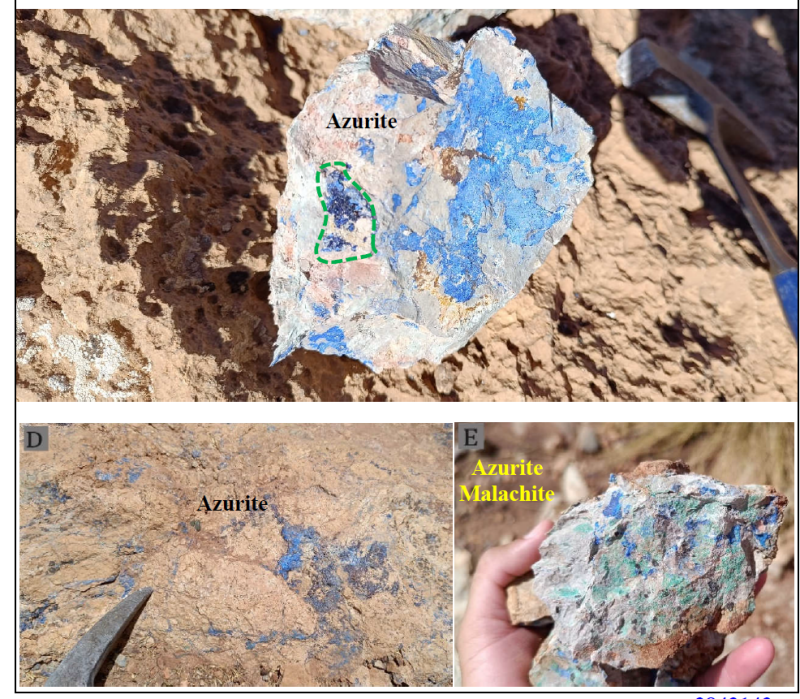 The veins on the project area exhibit thicknesses ranging from approximately 0.50 to 4.00 m. According to their orientation, the strike of these vein structures ranges from NE–SW to NNE–SSW. During the most recent field visits, a set of copper and lead indications were identified within the carbonates and along the major regional fault of Tizi n’Test all hosted within the same marly to marly‑sandstone facies. A number of these occurrences have been subject to exploitation (artisanal mining) of varying duration. See Figures 5 and 6. The steeply-dipping veins exhibit characteristics consistent with known copper-lead-silver veins throughout the mining district.