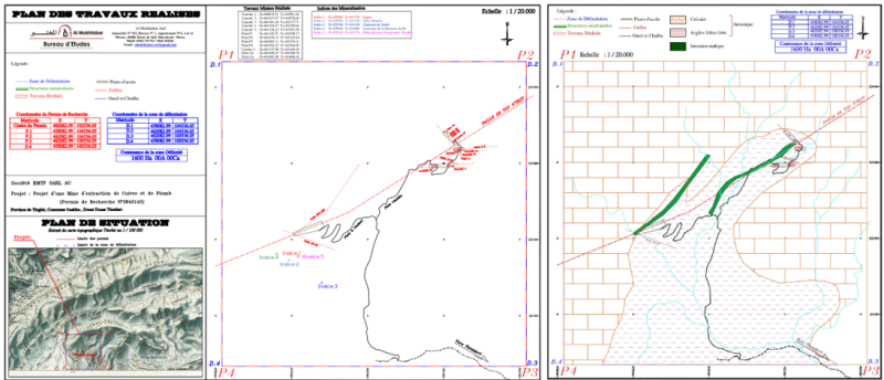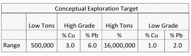 The Conceptual Exploration Target is based on mapped structure lengths from surface workings and recent site investigations by STE MINIERE EMTF SARL AU, a Moroccan service company specializing in industrial infrastructure and mining development. Documented vein widths up to 4m have been mapped with lateral extents limited by surface mapping up to 400m; down-dip for the low tonnage scenario are limited to 50m while it is reasonable to expect extensions to 500 meters potential vertical depth. Both the lateral extent and down dip are open at this time, but the exploration target is limited to 800m maximum length and ~500m down dip. Grade ranges utilize estimates based on assays and mapping; there are no known drill intersections on which to rely. The exploration target provides an upper and lower grade limit range based upon an average grade for the veins for copper and lead based on mapping and sampling.