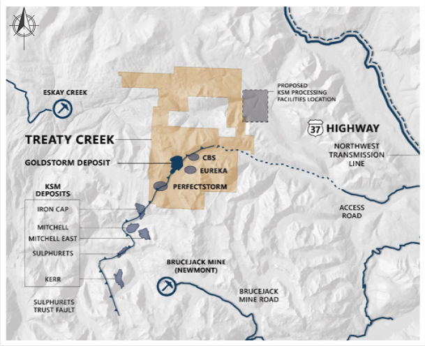 The Treaty Creek Project not only contains the Goldstorm Deposit (a large gold-copper porphyry system) it also hosts several other prospective zones of mineralization lying along a north-northeast trending axis following the trace of the Sulphurets thrust fault. This thrust fault is spatially related to all of the porphyry deposits on the neighbouring KSM property (owned by Seabridge Gold) as well as the Treaty Creek property.