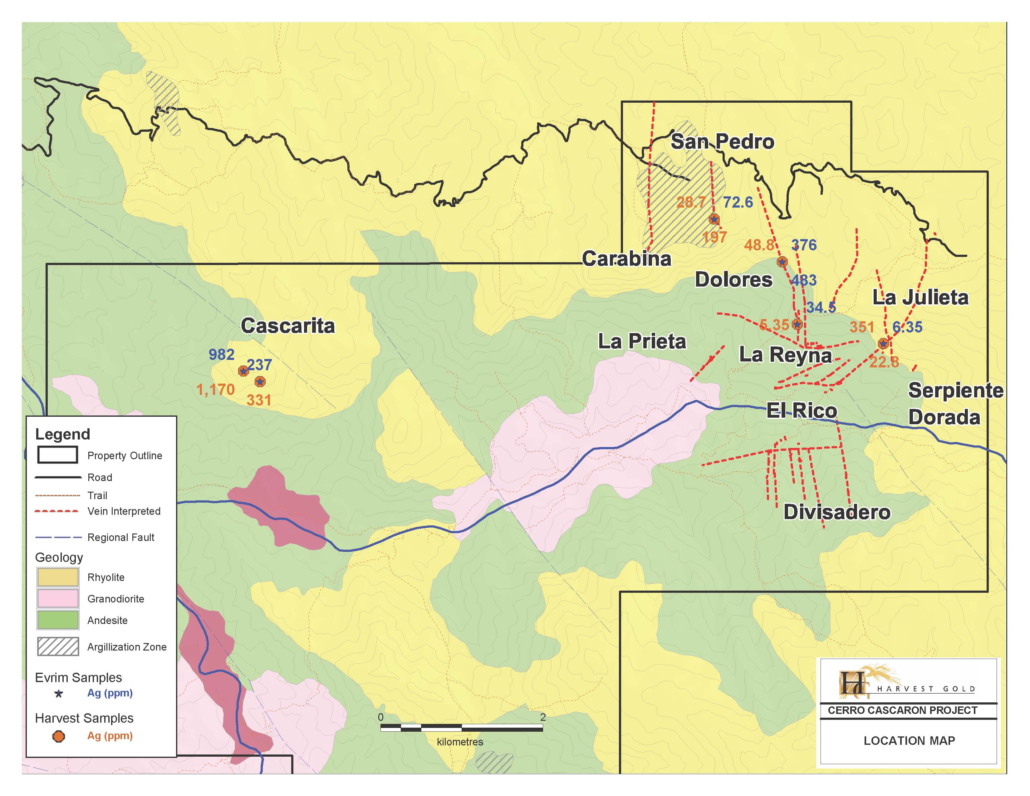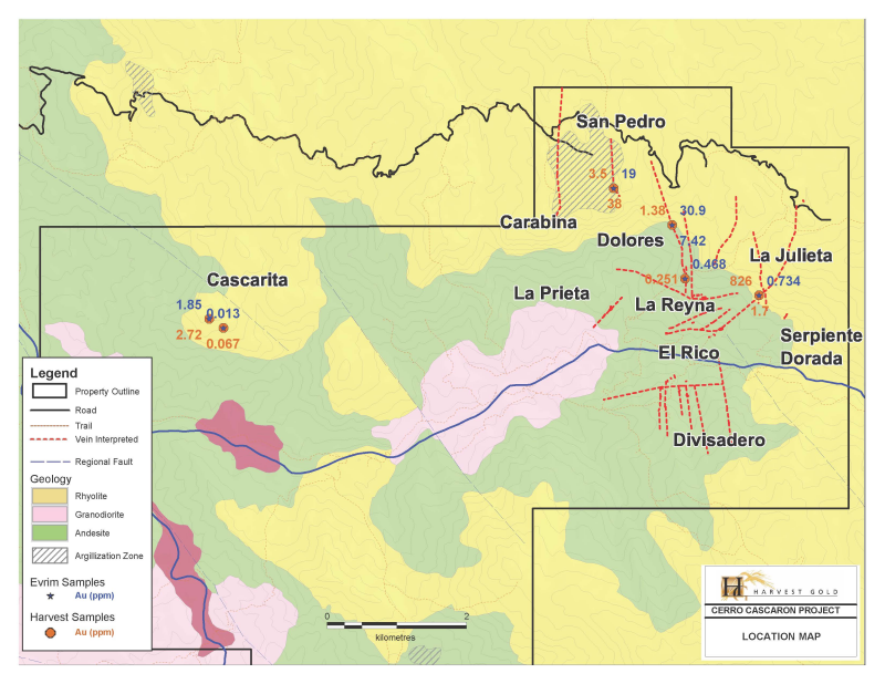 As part of its due diligence, Harvest Gold retained Mr. David Bent, P. Geo., as a geological consultant to visit the project. Mr. Bent was able to inspect most of the project and took nine rock samples from both the main gold vein field and a newly discovered, silver rich breccia and vein target called La Cascarita, located five kilometres west of the currently defined main gold field. The rock samples twinned previous samples taken by Evrim to confirm previous assay results. Gold and silver sample locations and comparative assay results are provided below.