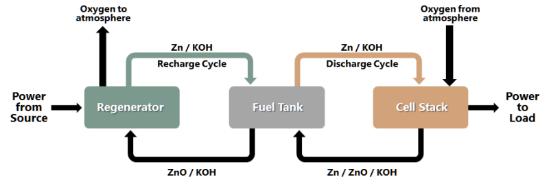 ZincNyx’s technology consists of three main subsystems that use zinc and air to store energy in the form of zinc particles. When the system is delivering power, the zinc particles are combined with oxygen drawn from the surrounding air. When the system is recharging, zinc particles are regenerated and oxygen is returned to the surrounding air.