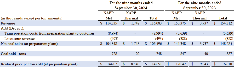 The Company’s fourth quarter 2024 sales volumes are expected to be higher than the third quarter of 2024 and comparable to historical averages. Compared to the third quarter of 2024, the fourth quarter of 2024 is forecasted to have similar production from our deep mines, decreased production from our surface mines due to reduced highwall miner operations, and lower purchases of third-party coals related to market conditions. Metallurgical coal selling prices are expected to be lower than the third quarter of 2024 due to increased participation in the export market and exposure to market-based prices. Cash cost of sales is expected to be similar to the previous quarter. Selling, general and administrative expenses are expected to be comparable to the third quarter of 2024. The main priorities of the Company are reducing costs and increasing efficient production while maintaining a balance between our open position and positive cash margin opportunities. We are committed to improving the Company’s balance sheet with minimized downside financial risk but are also focused on organic growth opportunities to complement our existing operations. The Company’s capital allocation and deployment strategy will be aligned with these priorities and the Company’s financial position.