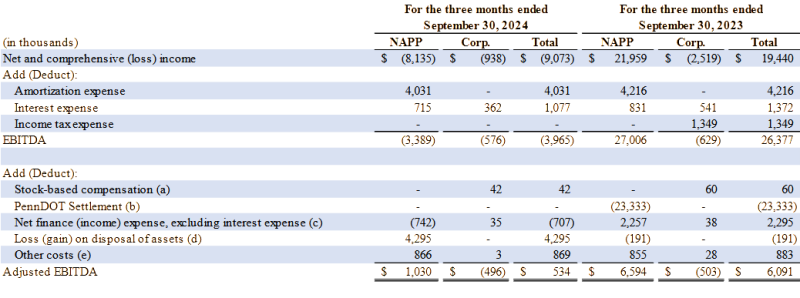 EBITDA and Adjusted EBITDA for the three months ended September 30, 2024 and 2023
