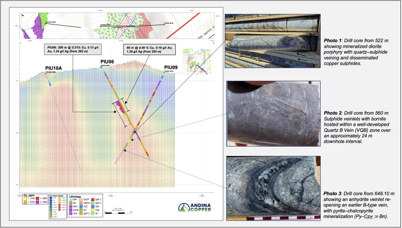 Observations from PIU09 provide geological support for the interpretation of a deeper mineralized source. Downhole logging records an increase in porphyry vein density and intensity with depth, including the development of well-formed quartz B-type veins with anhydrite–sulphide re-opening and associated chalcopyrite ± bornite mineralization.