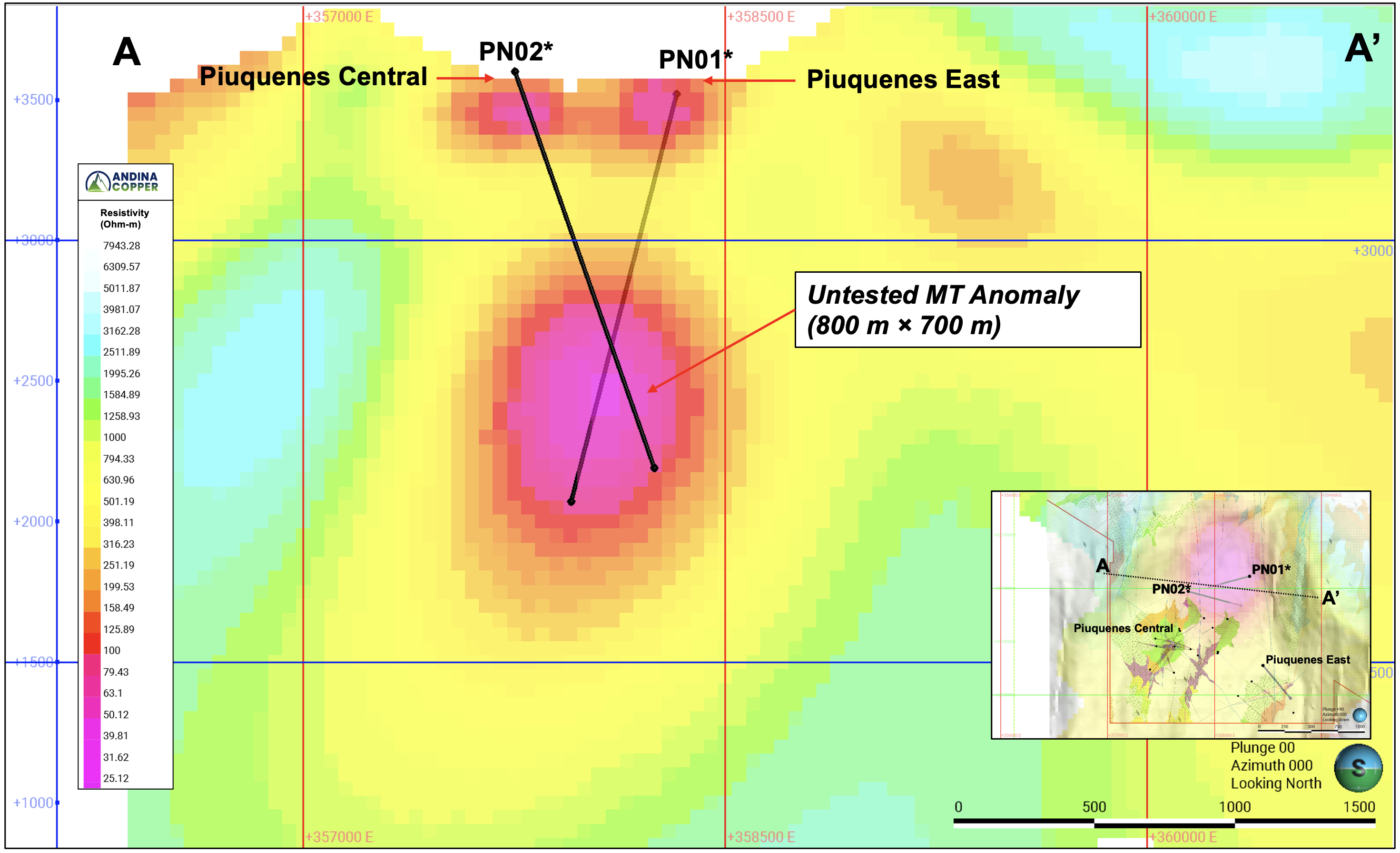 Figure 4: Cross-section A–A′ highlighting a significant, untested Piuquenes North MT anomaly (~800 × 700 m) at Piuquenes North, defining planned priority targets PN01* and PN02* (planned hole *).