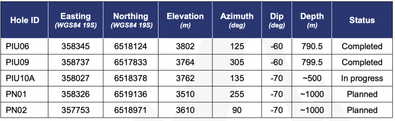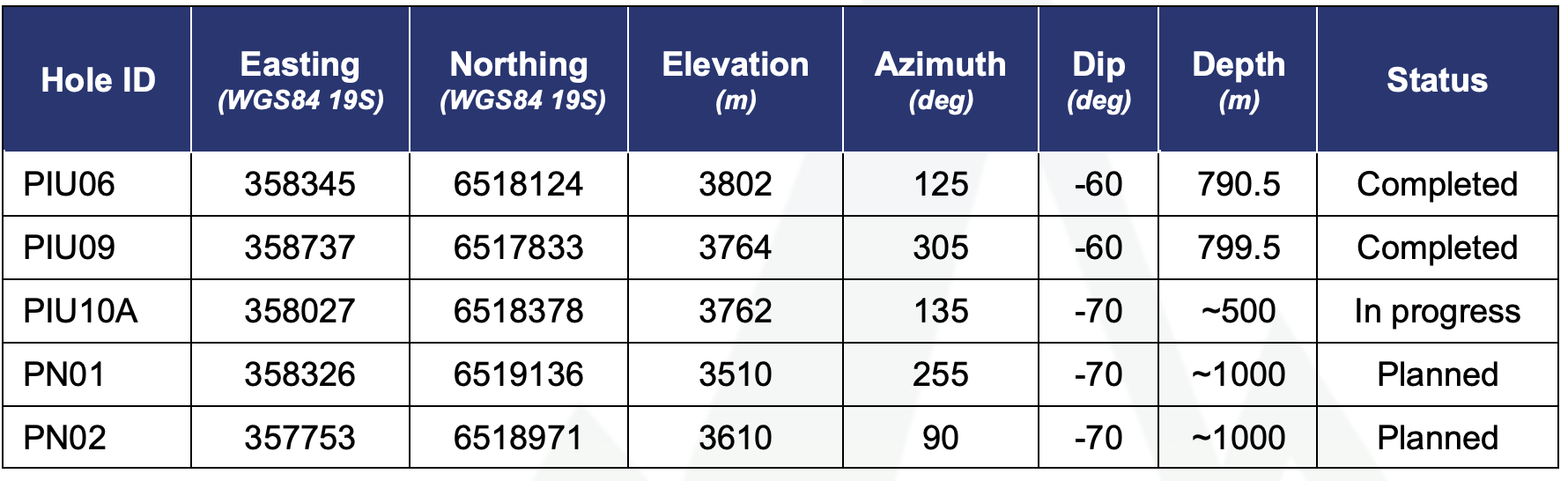 PIU10A is currently being drilled and is designed to test a high-priority target located between the Piuquenes East and Piuquenes Central zones.