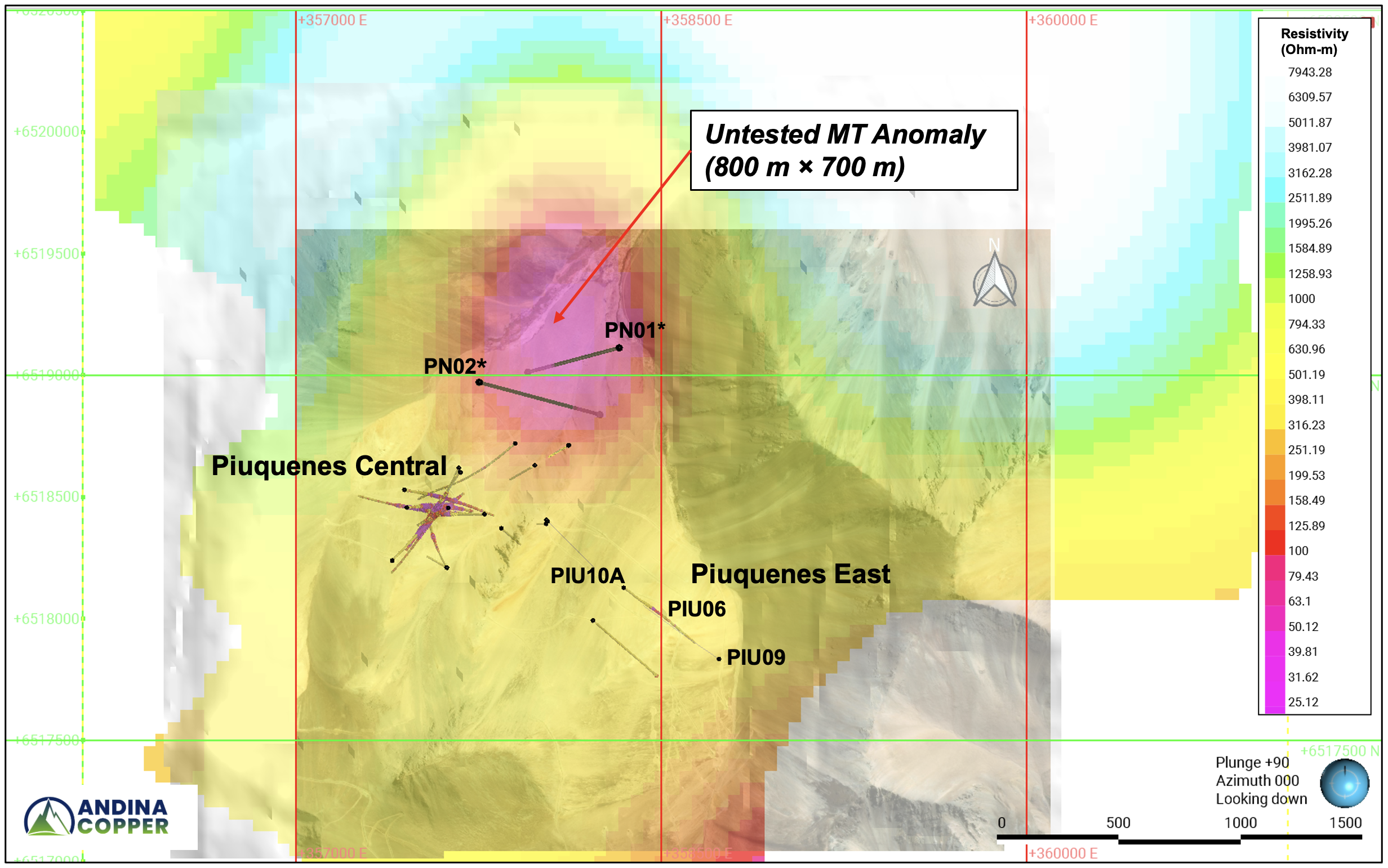 The MT survey completed in December has identified a coherent, deep-seated, low-resistivity anomaly at Piuquenes North that extends well below the limits of current drilling and beneath the known mineralized centres at Piuquenes East and Piuquenes Central. The anomaly is characterized by its low-resistivity contrast, significant vertical extent commencing ~600 m below surface.