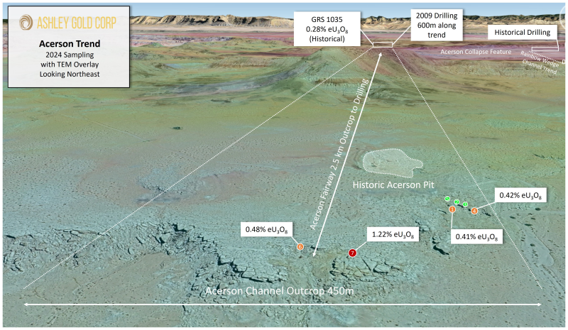Darcy Christian, CEO of Ashley comments “The positive assay results at the Acerson outcrop highlights the prospectivity of the larger Sahara Property. At ~450m wide and trending north 2.5km to a major collapse feature Acerson appears to be of similar size as the Sahara mine with room to extend both deposits with additional drilling. With additional known mineralization at Big Body and Cecilliate I believe we are looking at a multi-million pound uranium potential within the known mineralization trends with significant upside potential to the east and north.