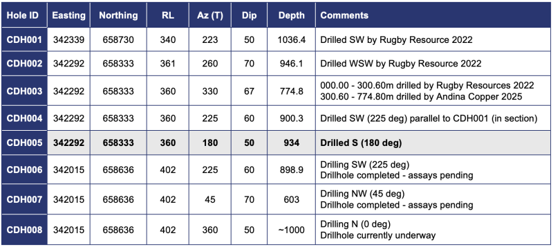 Following the high-grade Cu-Mo intersections reported in recent drillholes (CDH003 and CDH004 – refer 16 February 2026 News Release), CDH005 was designed to test the southern extensions of the Cobrasco system to a depth of 700m, in a large step-out over an area of limited geological data and no prior drilling.
