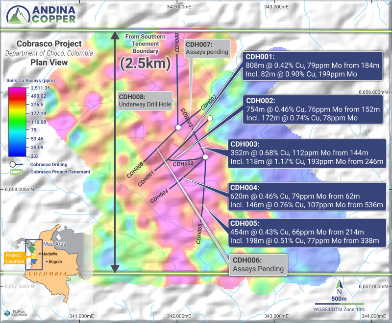 March 24, 2026 – TheNewswire - Vancouver, British Columbia. Andina Copper Corporation (TSX-V: ANDC | FSE: FIR | OTCQB: PMMCF) is pleased to report an outstanding drill intercept from hole CDH005, the third hole completed by the Company at its Cobrasco Project in Chocó, Colombia.