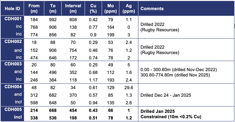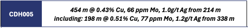 CDH005 confirms large-scale southerly extension of Cu-Mo-Ag mineralization: