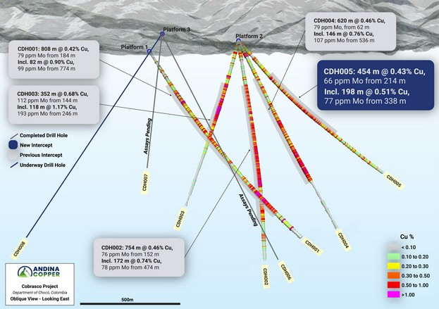 Andina Copper Extension Drilling Intersects 198 m at 0.51% Cu, 78 ppm Mo within 454 m at 0.43% Cu, 66 ppm Mo