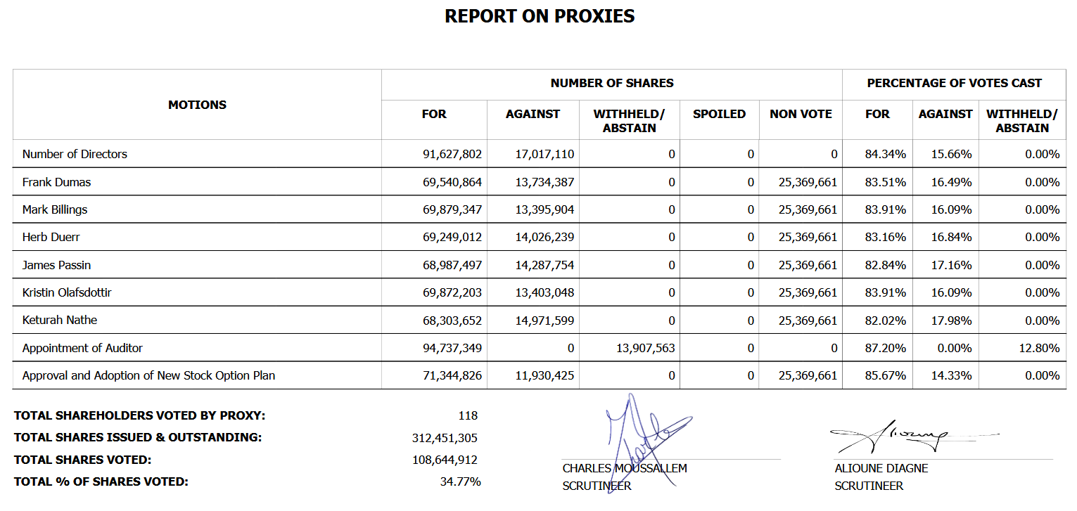 The scrutineers from Computershare Investor Services Inc. reported that the vote at the AGM, in person or by proxy, amounted to a total of 108,644,912 shares, being 34.77% of the total 312,451,305 outstanding shares of St-Georges Eco-Mining Corp.