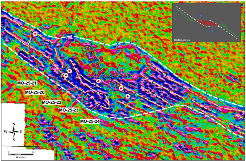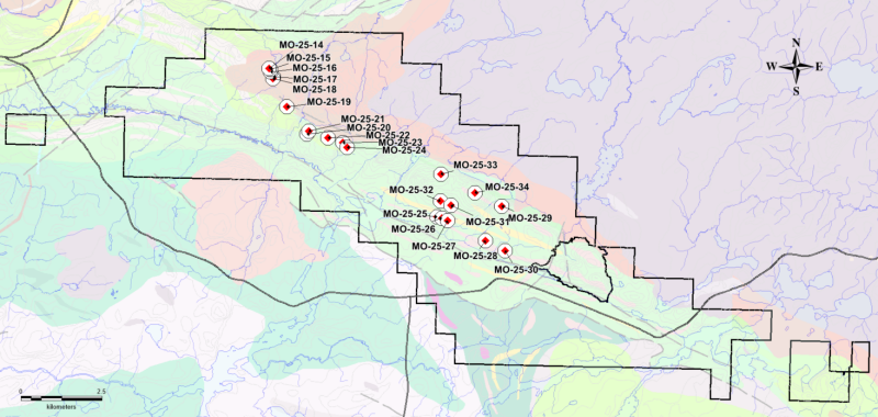 Highest grade assays from the second batch of 5 drill holes include 2.40 g/t Au over 1.4 m (MO-25-21) and 1.26 g/t Au over 1.5 m (MO-25-20)