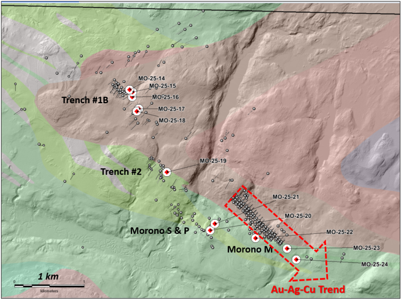 The most southerly hole to date, located 330 m to the SE of the Morono deposit, intersected multiple intervals with anomalous and coincidental Au-Ag-Cu mineralization over the length of the hole (MO-25-24).