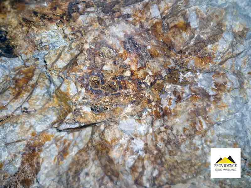 An under-explored system of both E-W and N-S trending gold-quartz lodes is evident at the La Dama De Oro property. Historic high-grade gold production was derived from three separate E-W striking lodes, the Mojave Girl, Tarantula, and Mojave Boy veins. The Tarantula, Mojave Boy, and strike extensions of the Mojave Girl lode have not yet been evaluated by the Providence team. The N-S trending lodes were not systematically prospected or developed in the past. They are strongly mineralized and remain excellent exploration targets, particularly at locations where they project to intersect or join the productive E-W striking lodes. In addition to the above, a zone of sheeted vein stockworks with visible mineralization was discovered on the adjoining mountainside; further work is being planned to determine the significance of the new discovery.