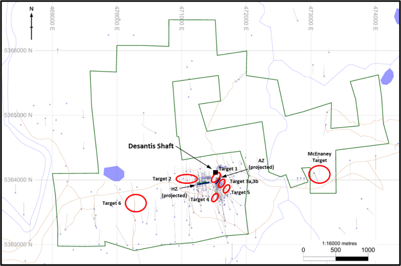 Six priority targets identified in and around the historic DeSantis Mine workings