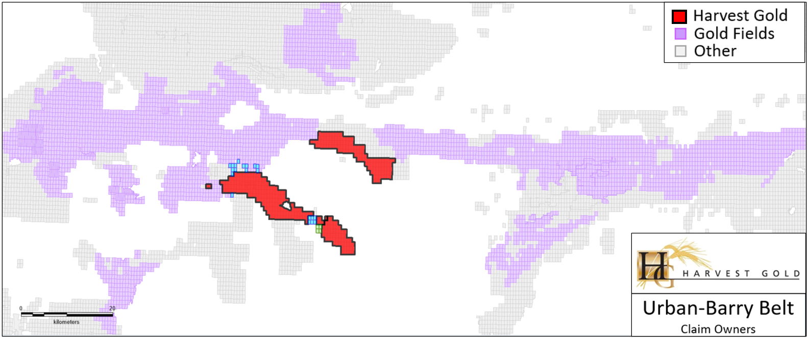 With this acquisition, Harvest Gold’s land position in the highly prospective Urban Barry Greenstone Belt now totals 401 mineral claims covering 21,372.81 hectares and over 50 kilometres of strike length of favorable and potentially mineralized structures, strategically located within the Urban Barry Greenstone Belt (See Figure 2).