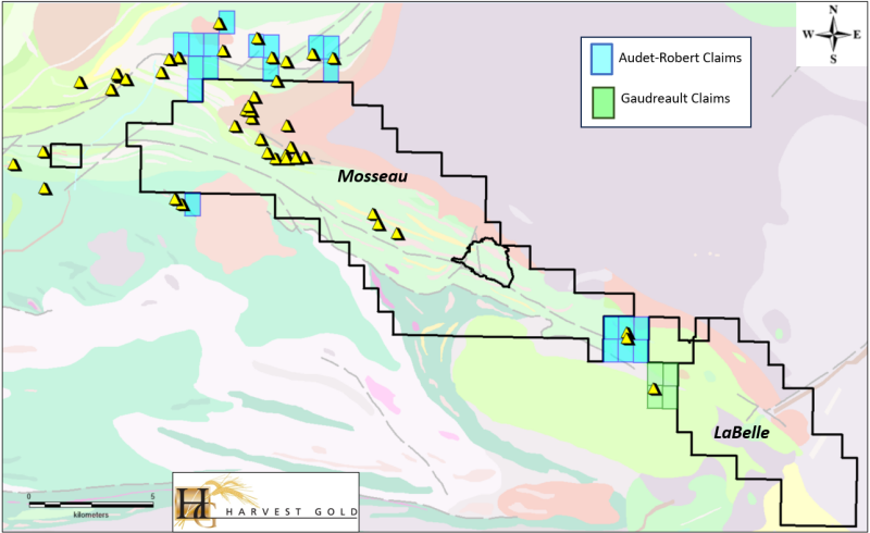 The Claims acquired by Harvest Gold cover 1,356 hectares in the Urban Barry Greenstone Belt of Quebec. The Claims expand the Company’s Mosseau Project along strike, both to the north and south, incorporating areas of favourable geology with documented historical gold and base metal showings. Historical work documented in the government's database (SIGEOM) has outlined five (5) additional mineral showings in the north part of the Mosseau property, extending into the Toussaint Deformation Zone and three (3) mineral showings to the south, adjoining the Mosseau and LaBelle properties (Figure 1).