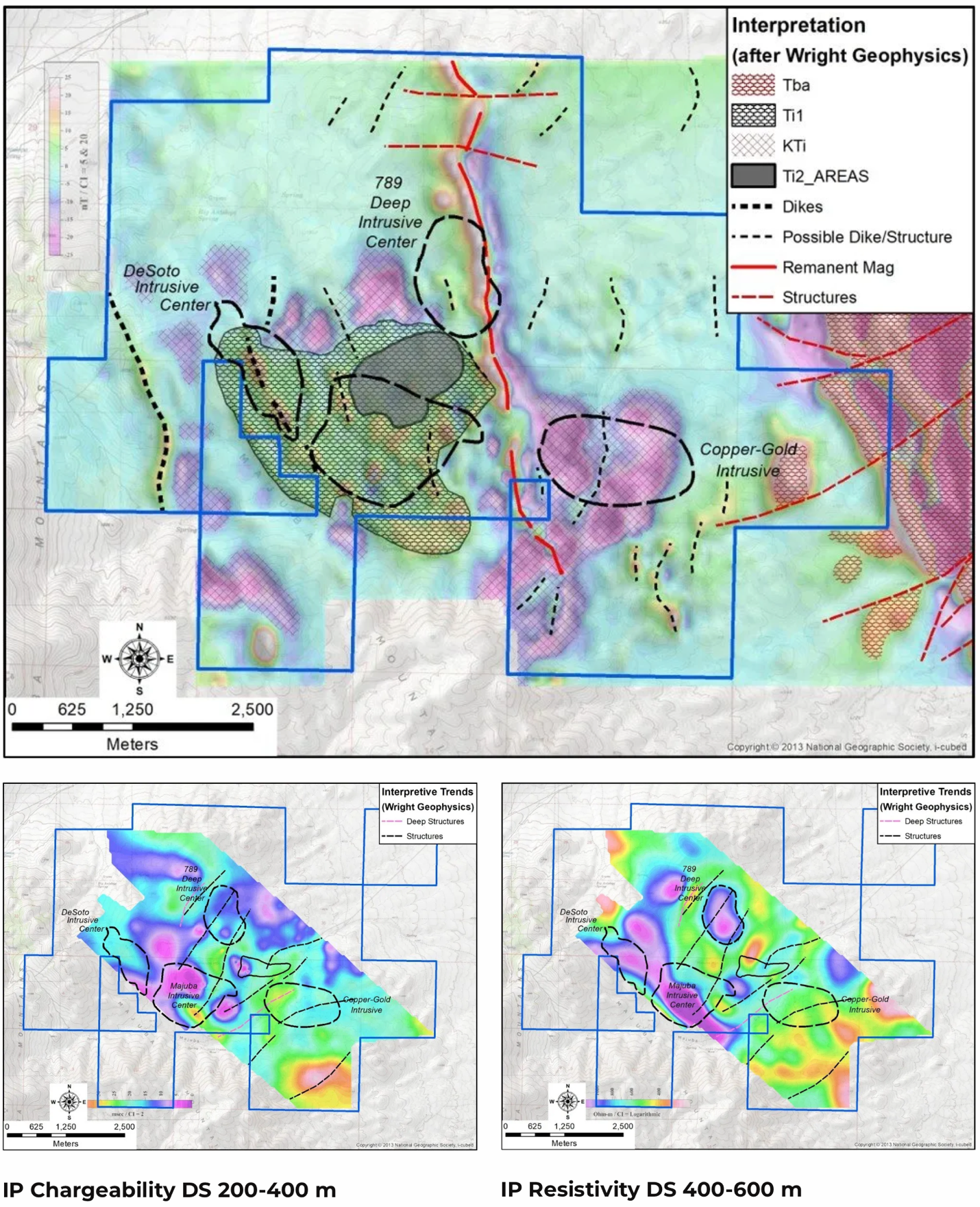 Figure 4. Geophysics including magnetics (top) and IP (bottom) at Majuba Hill