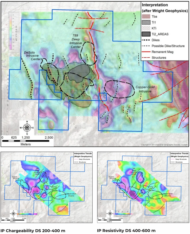 Targeting informed by resistivity data, which may highlight zones of potassic alteration and disseminated mineralization consistent with intrusive centers