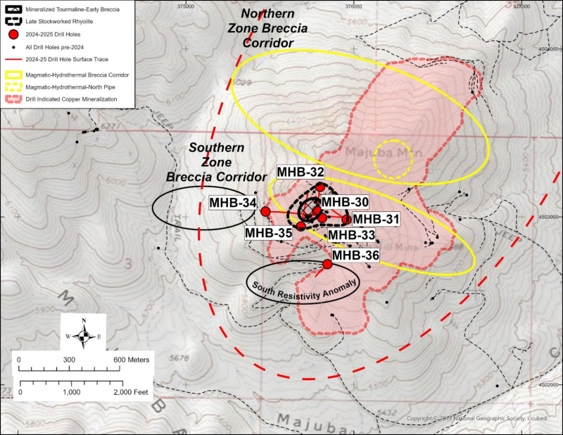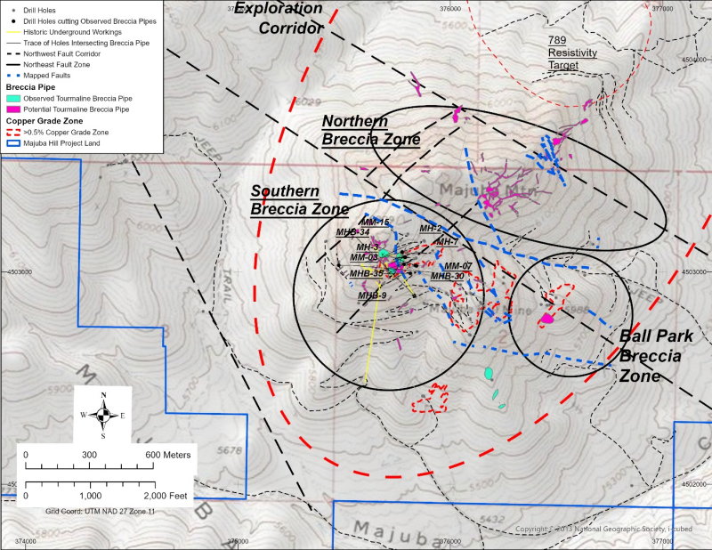 Figure 3. Plan view of Majuba Hill, showing previous drilling that intersected copper mineralized breccia pipes and identified breccia target zones.