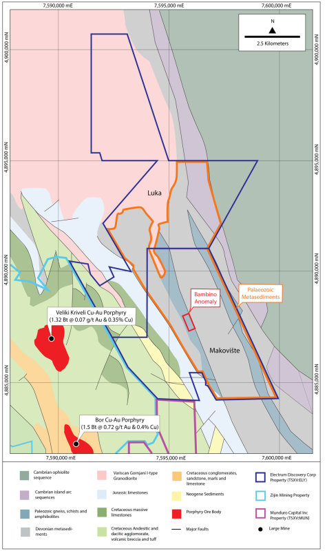 Figure 2. Simplified schematic geology map showing the position of Bambino anomaly, April 2024, Electrum Discovery Corp.