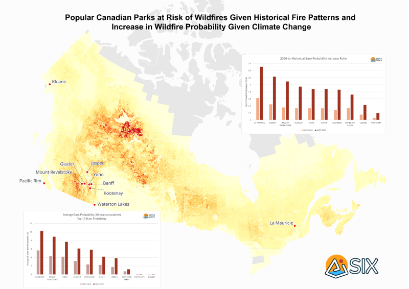 Figure 1 Map of Canada showing wildfire burn probabilities (yellow to red colours), and the top 10 Canadian parks at risk of wildfires given historical conditions and with highest increase in wildfire probability given Share Socioeconomic Pathways (SSP) 1 and 5 climate change scenarios by 2050. Note that the highest burn probabilities are concentrated in western Canada but that the location that will experience the most increase of wildfire probability is in the East.