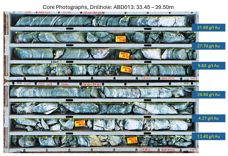 In combination, holes ABD012 and ABD013 have significantly extended a wide, high-grade zone of mineralization that was originally defined in 2022 by the Company and reported in drill holes ABR005 (15m @ 5.85 g/t Au), ABR018 (8m @ 5.47 g/t Au) and ABD001 (20m @ 7.70 g/t Au) – see Figure 2, below.