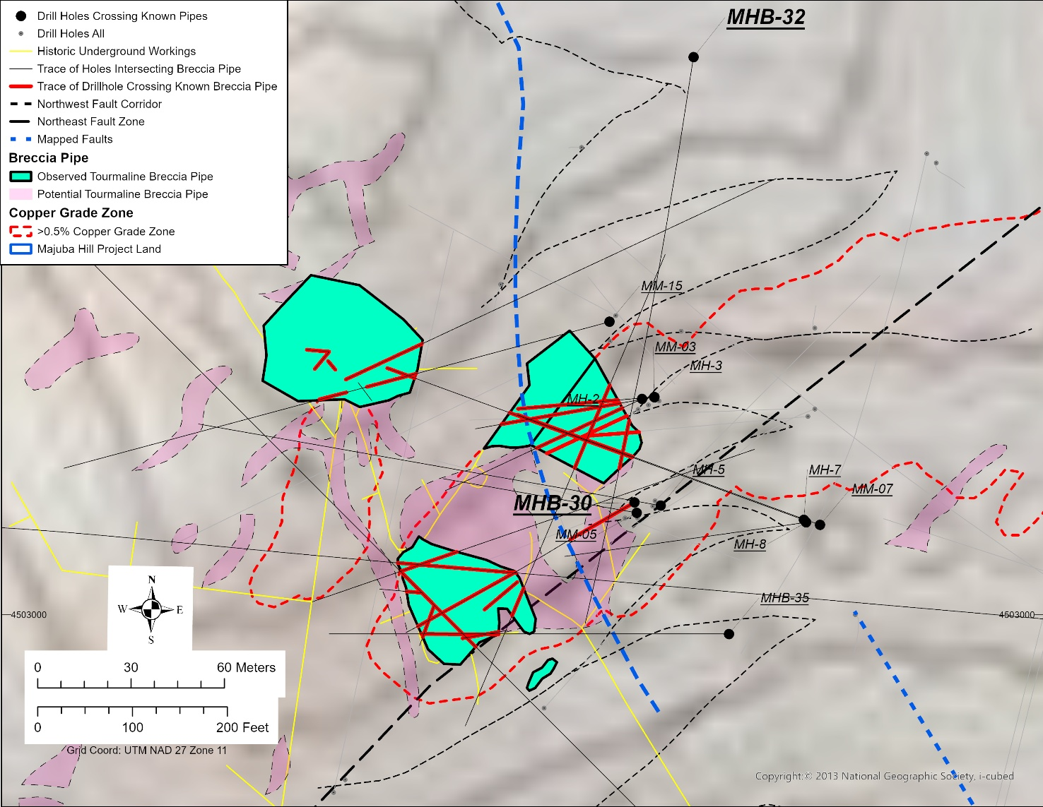 Figure 1: Majuba Hill showing Southern, Northern, and Ball Park Breccia Zones, tourmaline breccia pipes, and faulting