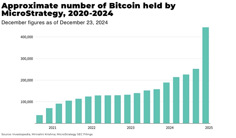 MicroStrategy's shares gained 3,200% since adopting Bitcoin as its treasury asset in 2020 to December 2024, by which time MicroStrategy had a market value of approx US$80 billion, while owning US$41 billion of Bitcoin. In particular, the company's stock surged 477% in 2024 as it more than doubled its Bitcoin holding and joined the Nasdaq 100.