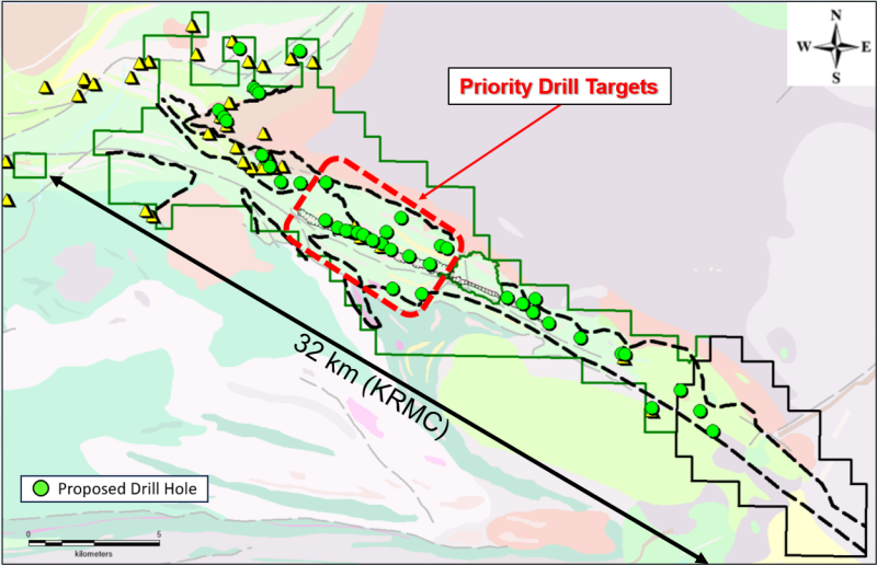 A high-resolution airborne magnetic survey was remarkably instructive as it showed that the KRMC extends far beyond the current drill area. The KRMC can now be traced for approximately 32 kilometres along strike and continues directly onto the LaBelle property. Exploration at LaBelle, including magnetic surveys, soil geochemistry, prospecting, and mapping, confirming this southeastern extension and identified several priority follow-up drill targets, highlighting strong district-scale discovery potential.