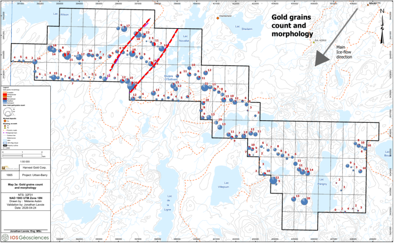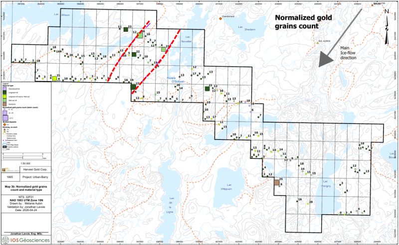 In the fall of 2025, a regional till sampling program was conducted by IOS on behalf of Harvest Gold. A total of 137 till samples were collected using hand shovel that yielded a total of 1175 gold grains. The average normalized gold grain count per sample is 10.52 grains, with a maximum of up to 27 gold grains.