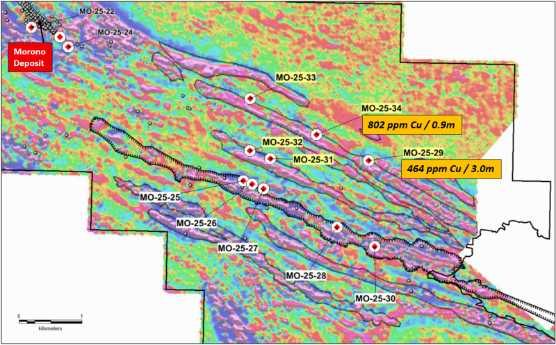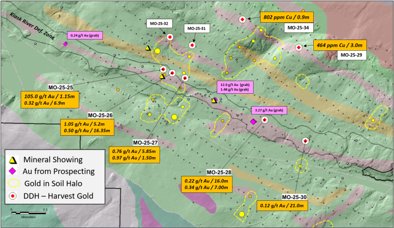 Harvest Gold would also like to report the results from the final 5 holes completed in its 2025 drill program (Table 1). The drill holes targeted gold in soil anomalies associated with magnetic highs to the north of the Kiask River Deformation Zone, in the central part of the Mosseau property (Figure 2, Figure 3). The most significant results from these 5 drill holes included anomalous copper intersections of 464 ppm Cu over 3.0 m (SW-25-29) and 802 ppm Cu over 0.9 m (SW-25-34). These anomalous Cu intersections are considered significant in that it reinforces copper as a key pathfinder for gold mineralization on the Mosseau property. Both these intersections are from a northern, previously untested horizon parallel to the Kiask River Deformation Zone and proximal to an untested gold in soil anomaly. This horizon is interpreted to represent a possible extension of the Morono deposit horizon, based on its proximity to the Wilson intrusion.
