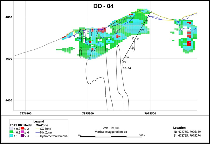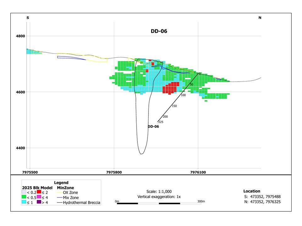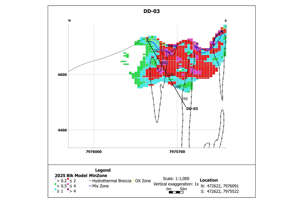 Hole MV25-DD03 has been drilled (depth of 275 meters) to explore the Choque Zone (Figure 1 & Table 1) at depth, below the area where higher gold grades have been calculated within the 2025 resource model (Wilson, 2025), (Figure 3). The hole intersected argillically-altered DAP. Intervals of hydrothermal breccia (Figure 4, lower tray), overprinting the DAP, were also intersected in the upper half of the hole. The porphyry is oxidized to a down-hole length of 12.5 meters.