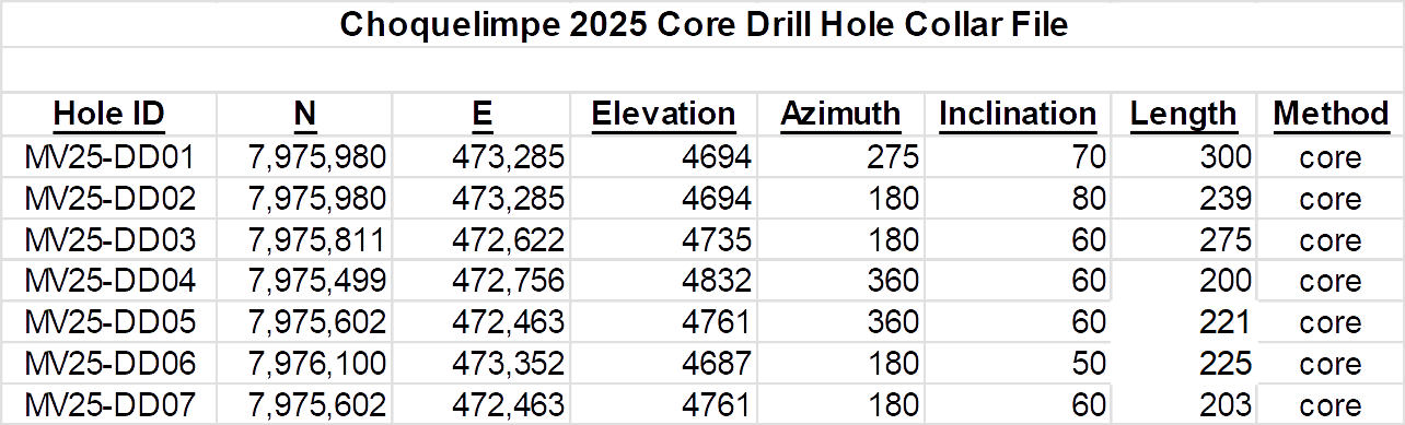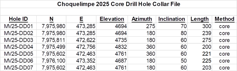 The 2025 Phase 3 drill campaign at Choquelimpie has successfully evaluated the down-dip extensions of higher-grade gold mineralization (>1 gram/tonne Au) hosted within hydrothermal breccia zones (Figure 1). Seven holes (7) core holes, for a total of approximately 1650 meters have been completed. The details of this program are shown on Figure 1 and Table 1.