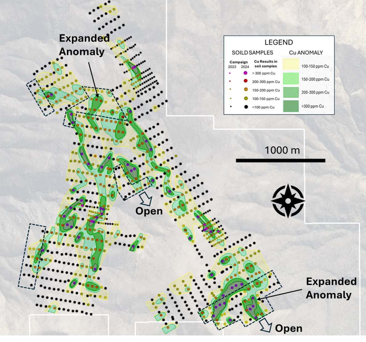 Figure 3. Copper-in-soil anomalies and expansion of the soil grid survey area, Polimet Gold-Copper-Silver Project. |