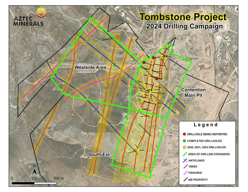 Aztec President & CEO, Simon Dyakowski commented, “Our initial drill results from the Tombstone RC drilling program commencing in late 2024 testing our updated geological model have not disappointed. The first 8 holes reported have returned strong grades of both gold and silver over broad widths and further expanded the shallow oxide mineralized zone, which is still open. With drilling now completed in this phase of exploration, we eagerly await the analysis and results of the remaining drill holes which targeted first pass drilling in the Westside Area, as well as the Southern Extension of the Contention Pit Zone.”