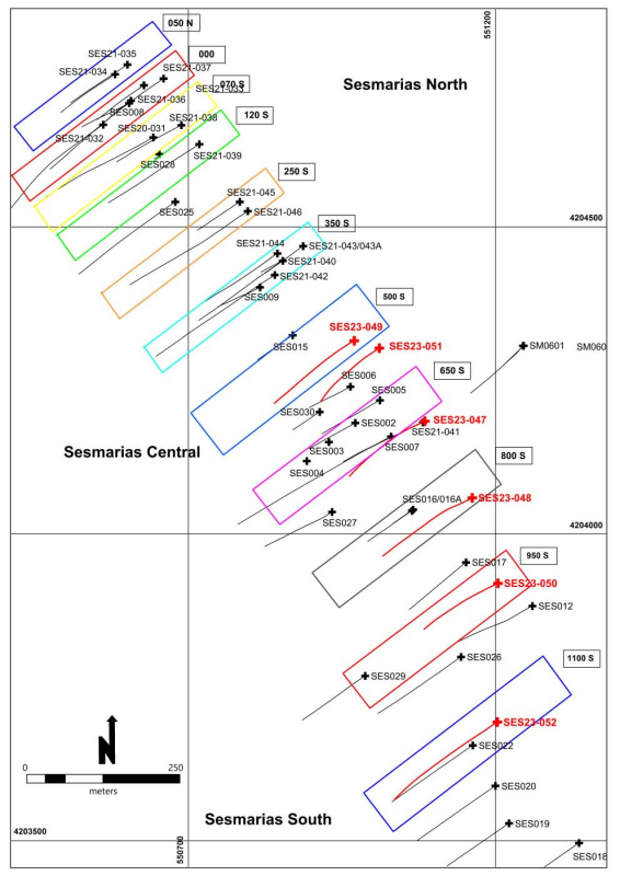 Figure 2. Sesmarias section lines, AVU generated. Drillholes in red were completed during 2023 drilling program. Coordinate system, UTM Zone 29 (ED50).
