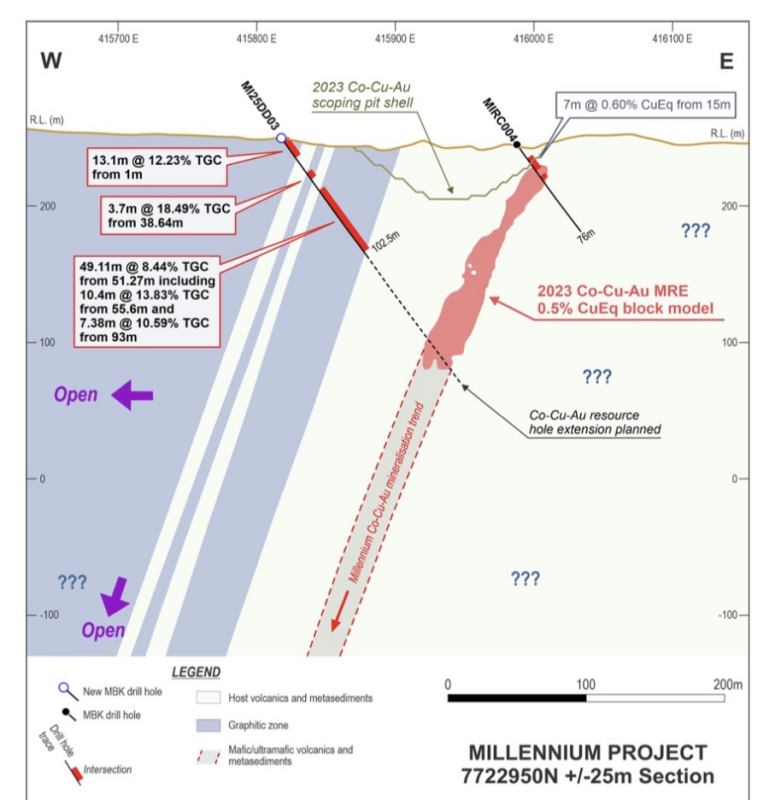 Figure 2: MI25DD03 7722950N section showing simplified lithology, drill traces and results, Millennium mineralised structure, 2023 Co-Cu-Au MRE block model and scoping study pit shell.