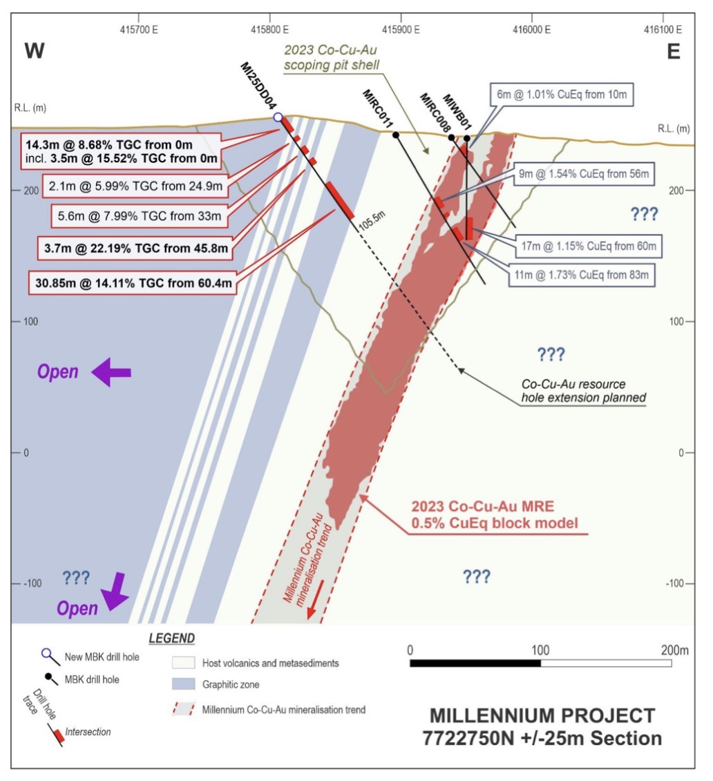 Drilling has confirmed thick, near-surface graphite mineralisation, highlighted by 13.1m @ 12.23% TGC from 1m in MI25DD03 and 30.85m @ 14.11% TGC from 60.4m in MI25DD04. The graphite zones occur adjacent to the existing Millennium pit design for the existing Co-Cu-Au Inferred Resource and, when combined with drilling completed in 2024, support the interpretation of laterally continuous mineralisation extending over more than 2km of strike.