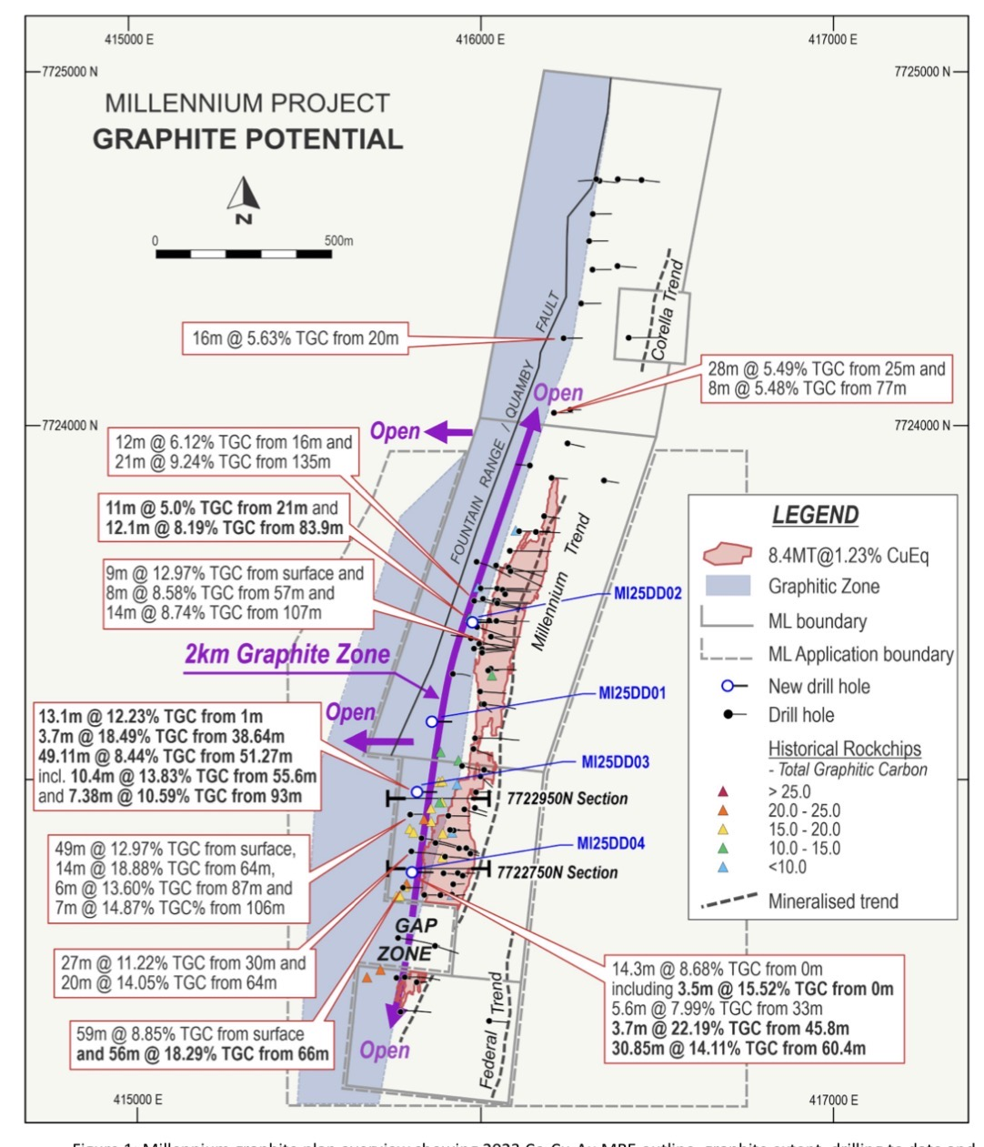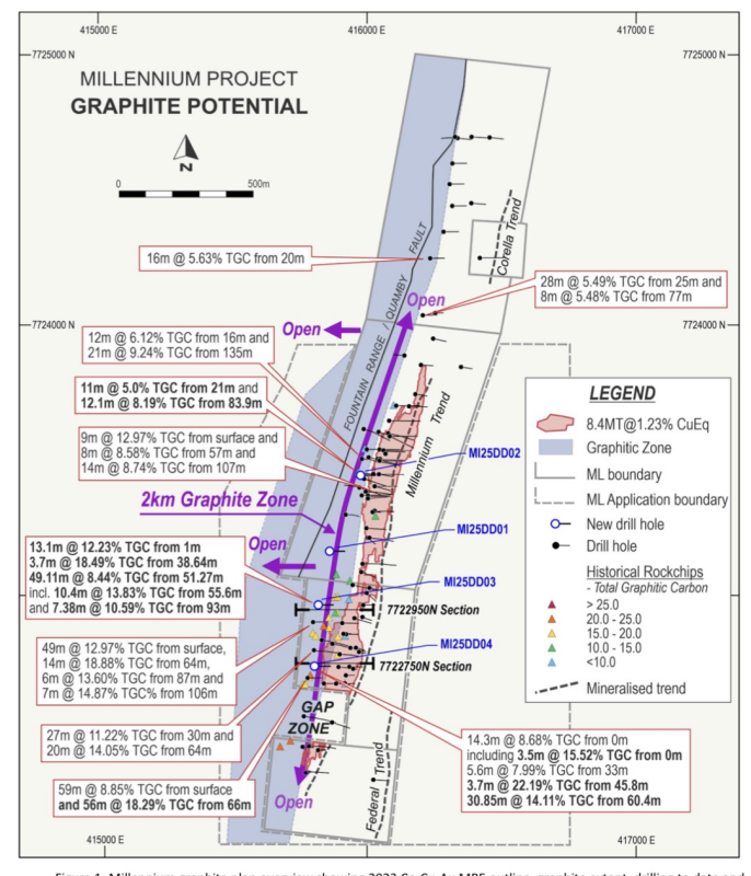 Four HQ diamond drill holes (MI25DD01–04) for a total of 462.8m were completed in December 2025 (Figure 1), following the 2024 identification of substantial hanging wall graphite mineralisation extending over approximately 2km of strike adjacent to the Millennium Co-Cu-Au JORC 2012 Mineral Resource Estimate (MRE) of 8.4Mt @ 1.23% CuEq on an Inferred basis.