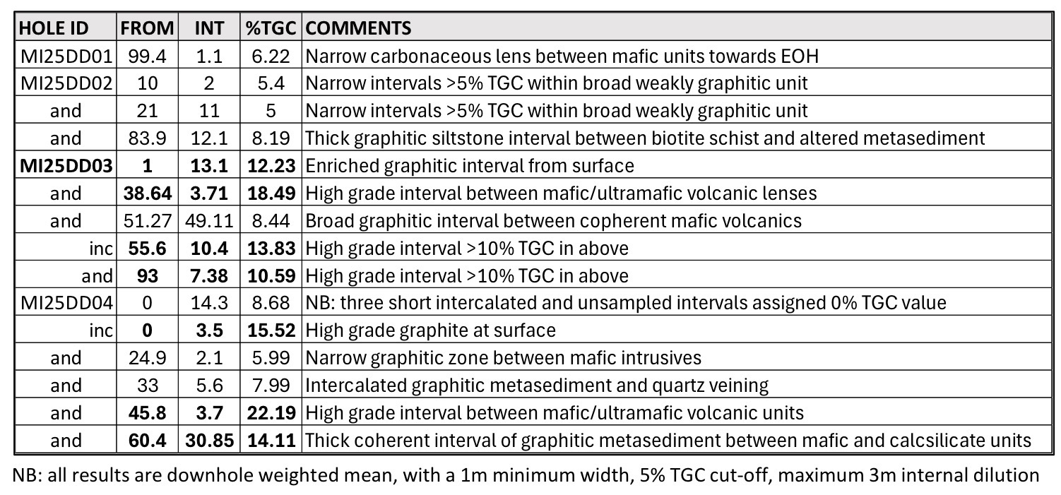 MI25DD01 intersected predominantly mafic to ultramafic units, with only a narrow graphitic interval returning 1.1m @ 6.22% TGC from 99.4m. MI25DD02 intersected multiple carbonaceous to graphitic metasedimentary units interbedded with mafic and calc-silicate lithologies, returning 12.1m @ 8.19% TGC from 83.9m within broader lower-grade graphitic intervals.