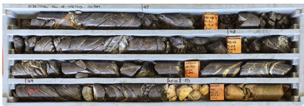 MI25DD04 (Figures 1, 4-5) intersected strongly graphitic units from surface progressing to intercalated graphitic metasediments, quartz veining and minor mafic volcanics before a highly graphitic zone from 45.8 to 49.5m corresponding to a strongly graphitic metasedimentary unit between mafic/ultramafic intrusives. Thick graphitic metasediments were also intersected from 60.4m to 91.25m before calcsilicates, mafic and minor carbonaceous/graphitic units to end of hole.